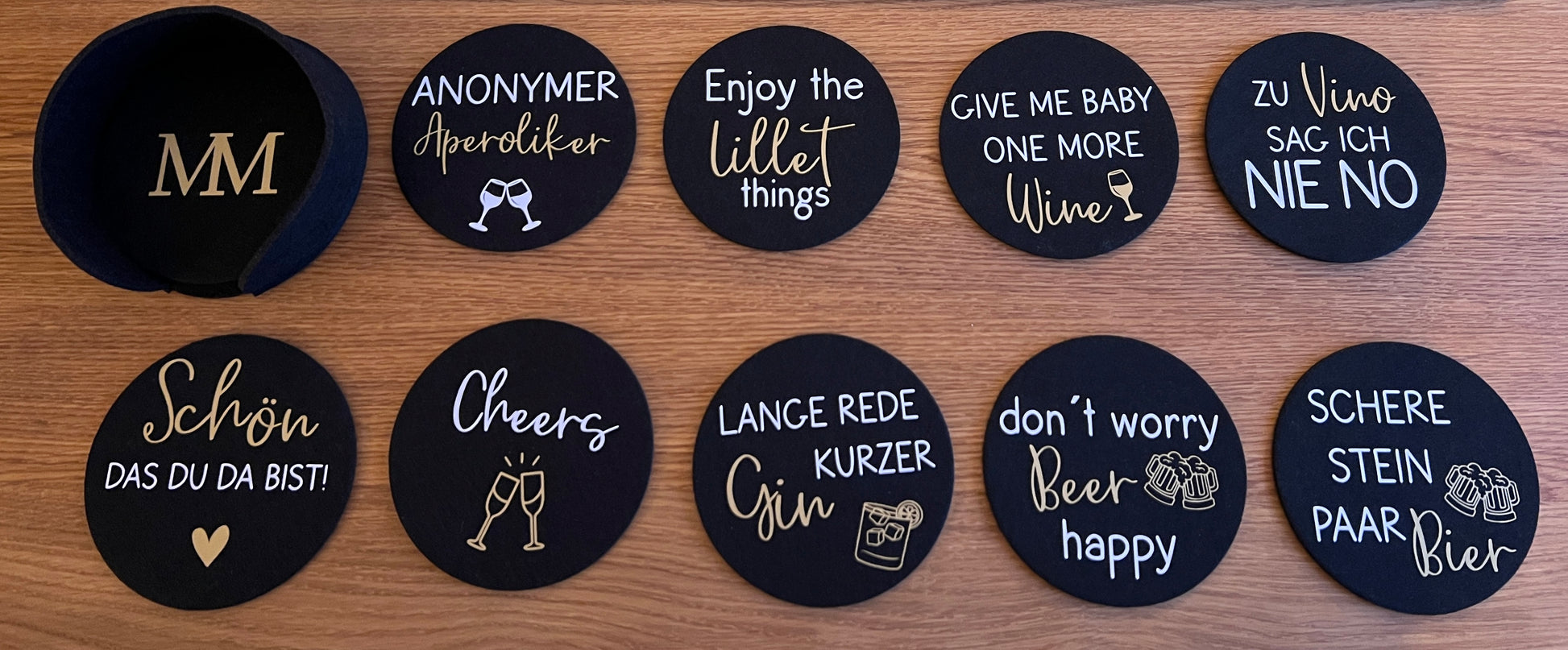 Alle Untersetzer liegen sicher in einer schwarzen Filzschale – so hast du sie stets griffbereit und stilvoll präsentiert. Ob bei geselligen Runden, beim gemütlichen Abend auf der Terrasse oder als charmantes Mitbringsel: Diese Filzuntersetzer sorgen garantiert für Gesprächsstoff und schützen deine Oberflächen mit urbanem Flair.