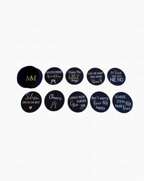 Dieses Set aus zehn runden Filzuntersetzern vereint praktischen Schutz für deine Möbel mit witzigen Statement-Sprüchen in edlem Gold- und Weißdruck. Jeder Untersetzer (Ø 10 cm) besteht aus hochwertigem, schwarzem Filz, der Kratzer und Feuchtigkeit zuverlässig fernhält – so bleiben Tisch & Co. makellos.