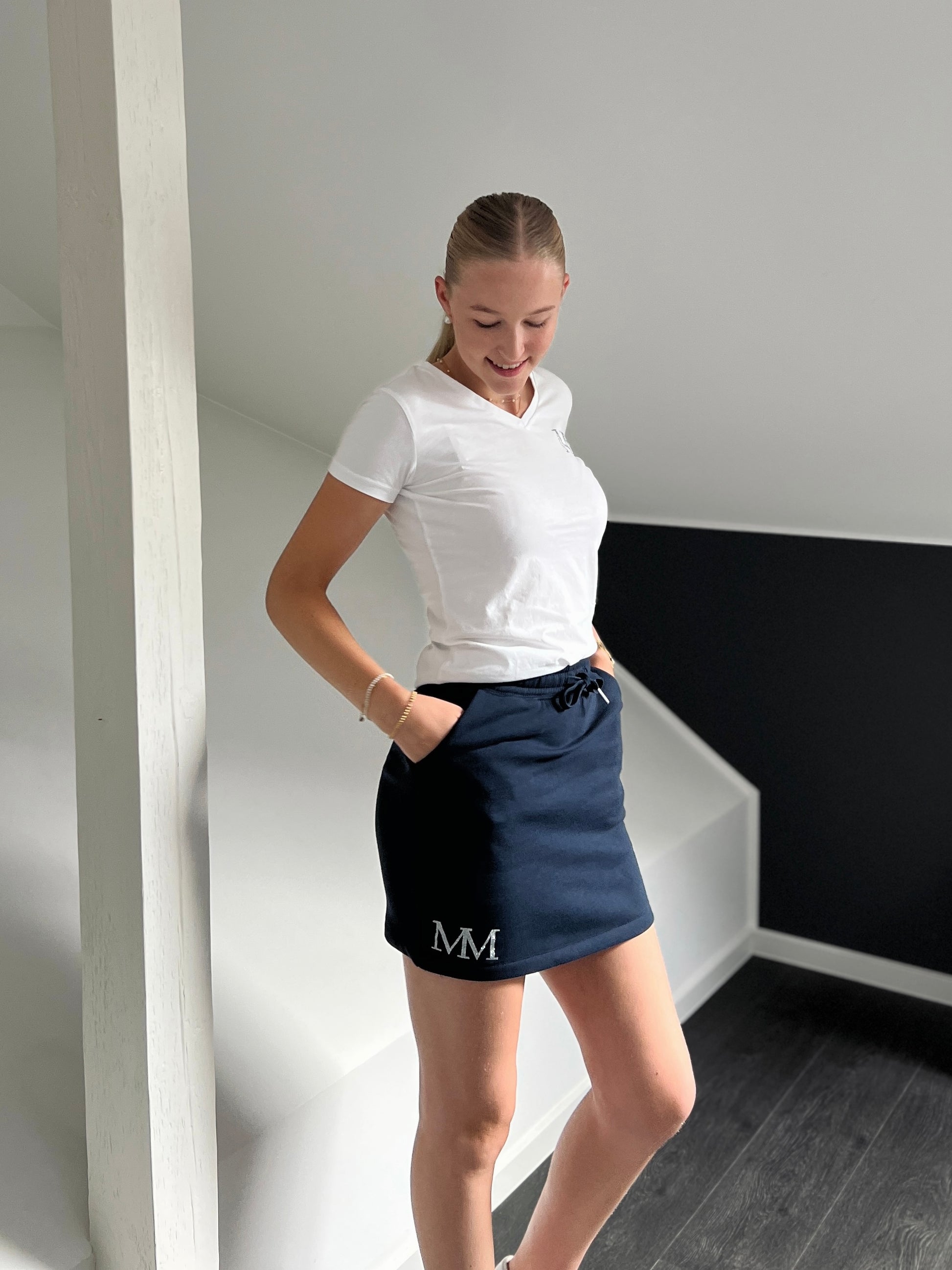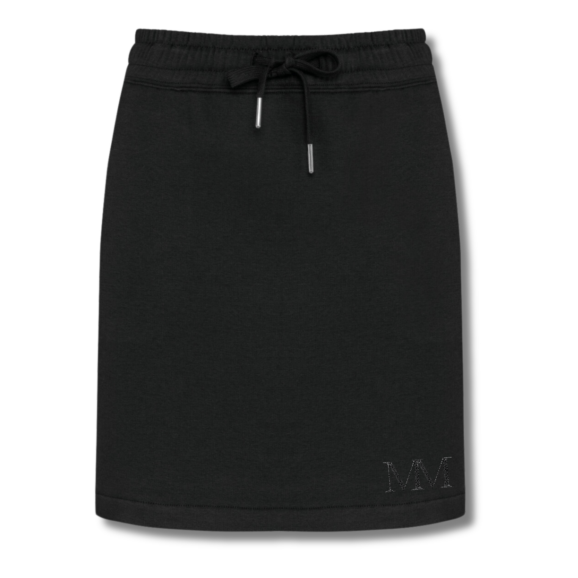 Zwei seitliche, schräge Taschen bieten praktischen Stauraum, während der glitzernde MM-Aufdruck dem Rock einen modischen Akzent verleiht. Mit einer schlichten Ziernaht am Saum eignet sich der Rock ideal für Arbeit oder Freizeit.
