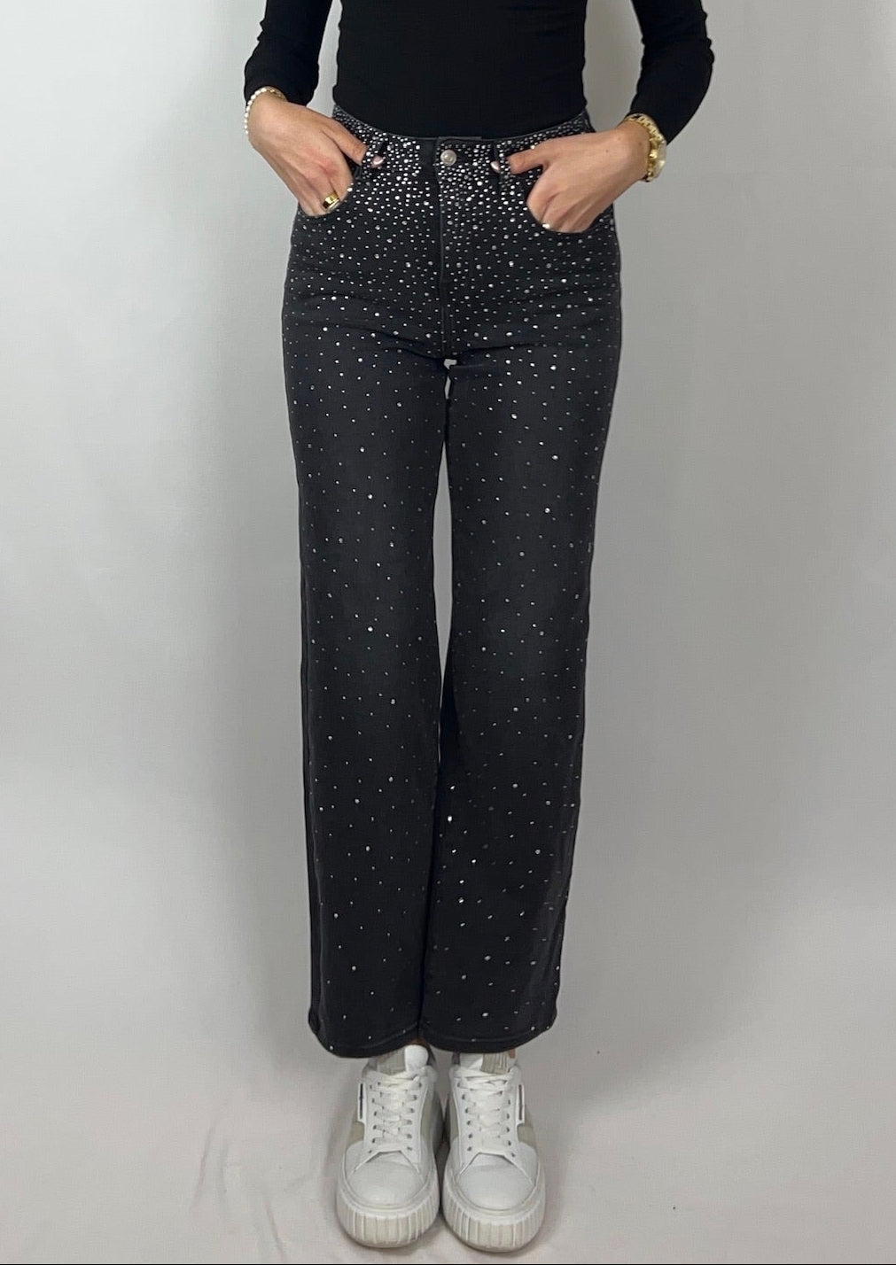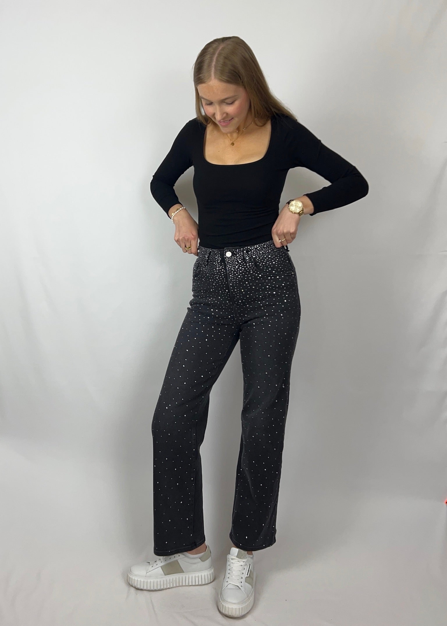Das Highlight? Glitzersteine, die entlang der Taschen für einen subtilen Sparkle sorgen und der cleanen schwarzen Jeans das gewisse Etwas verleihen. So wird aus einem Basic ein echter Eyecatcher.