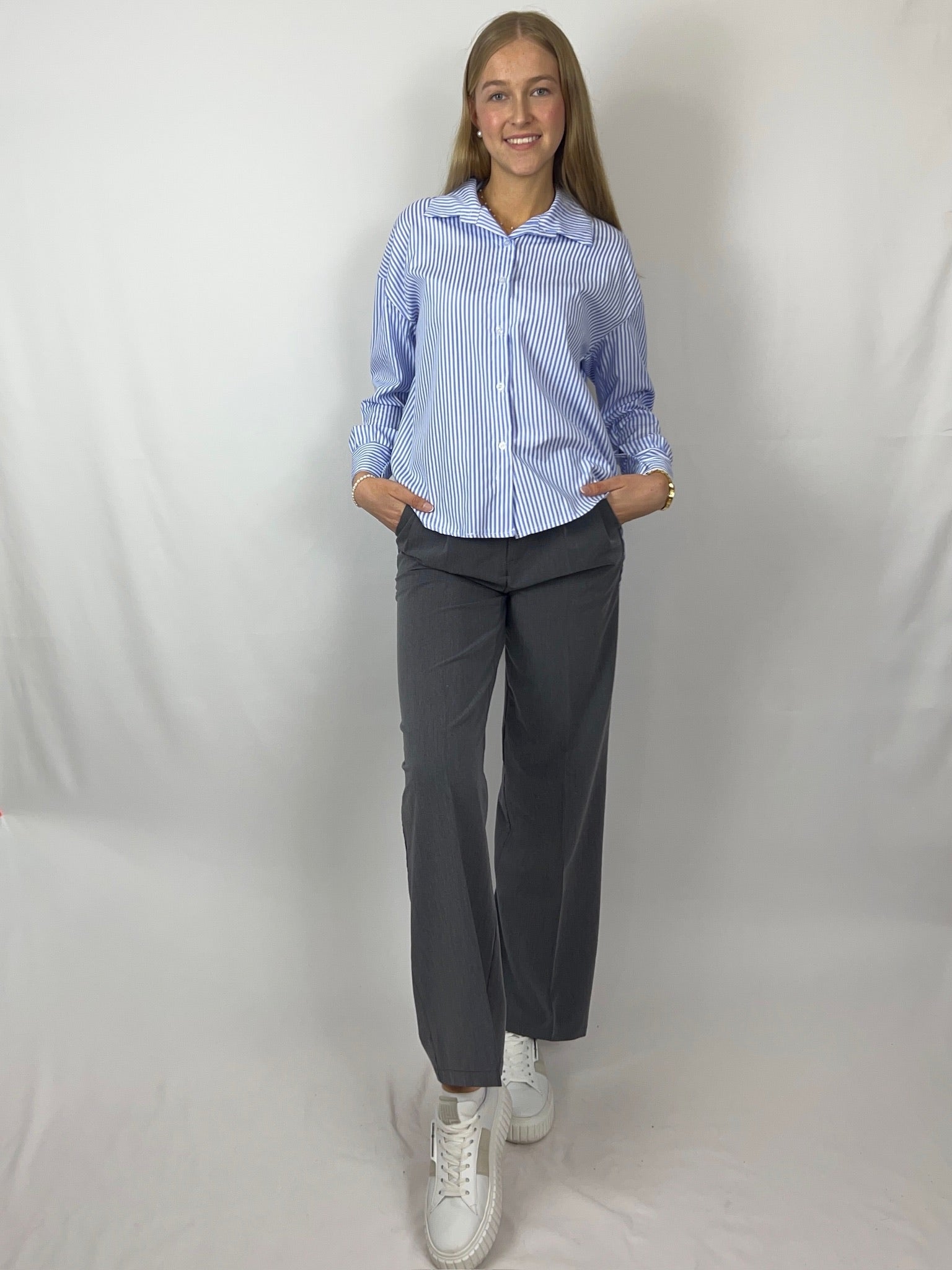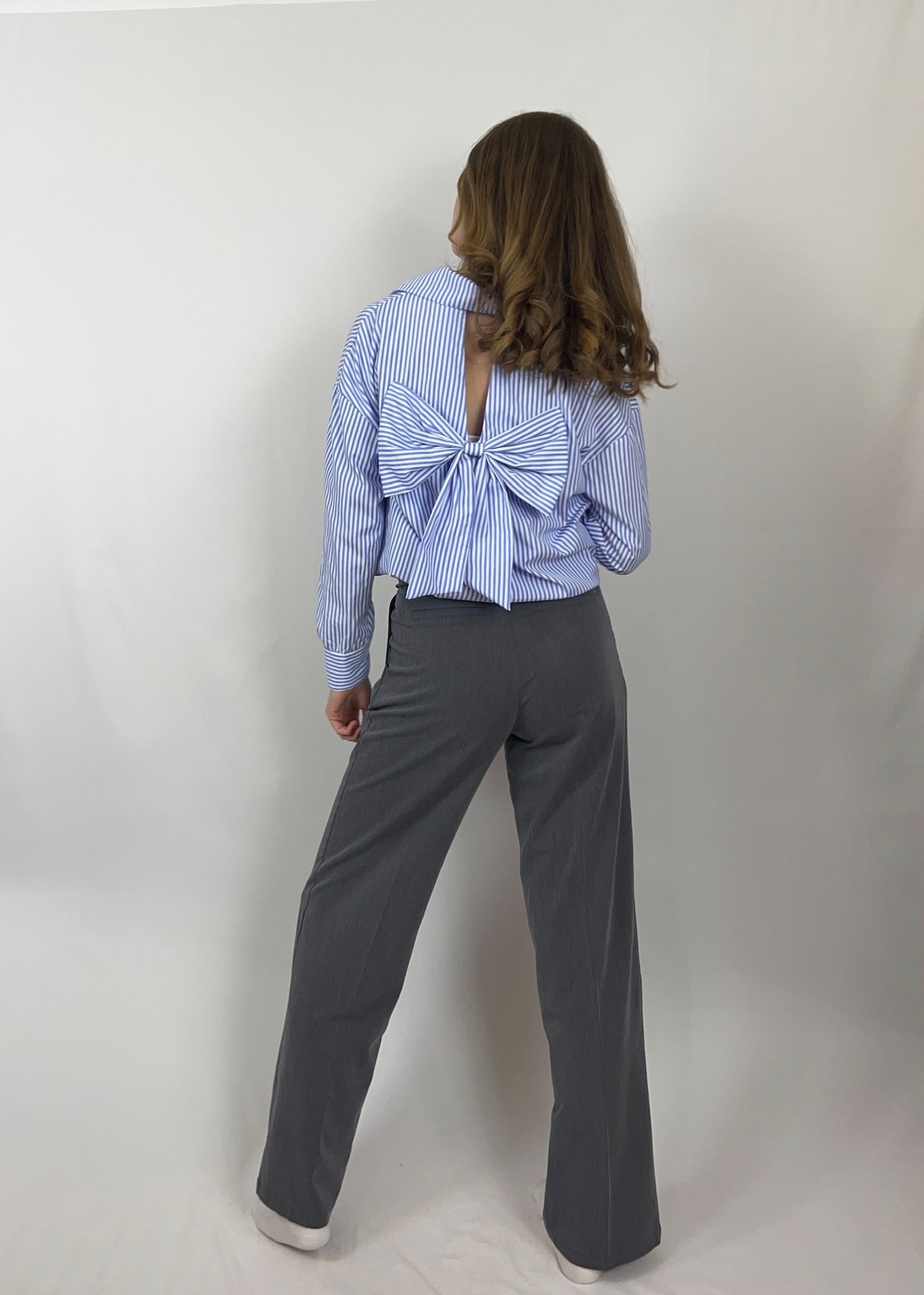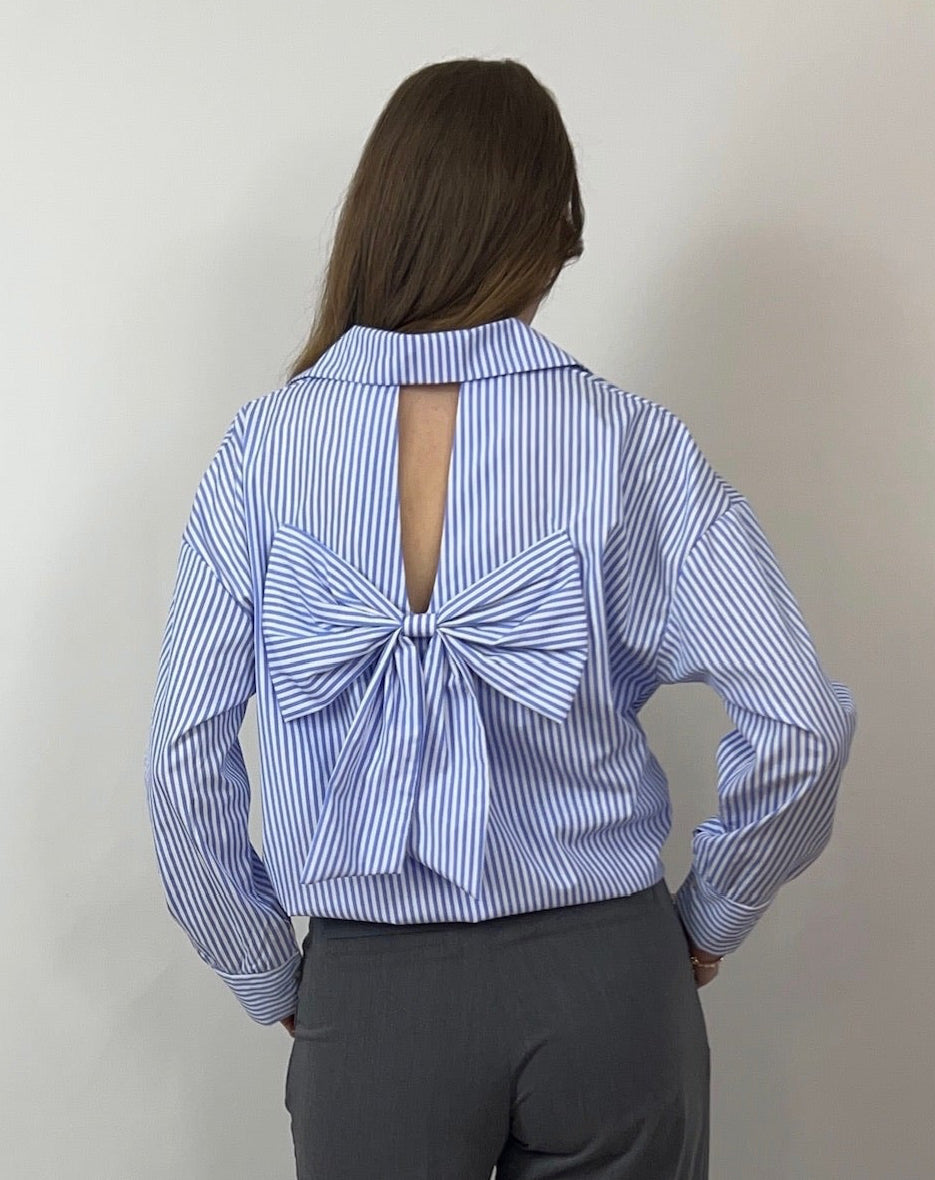 Das Hemd „Helia“ kombiniert klassische Streifen mit einem überraschenden Rückendetail: Die große Schleife und der dezente Rückenausschnitt machen dieses Piece zum absoluten Blickfang. Perfekt für alle, die feminine Highlights lieben und dennoch nicht auf Komfort verzichten möchten. Ein Must-have für stilvolle Everyday-Looks mit Wow-Effekt.
