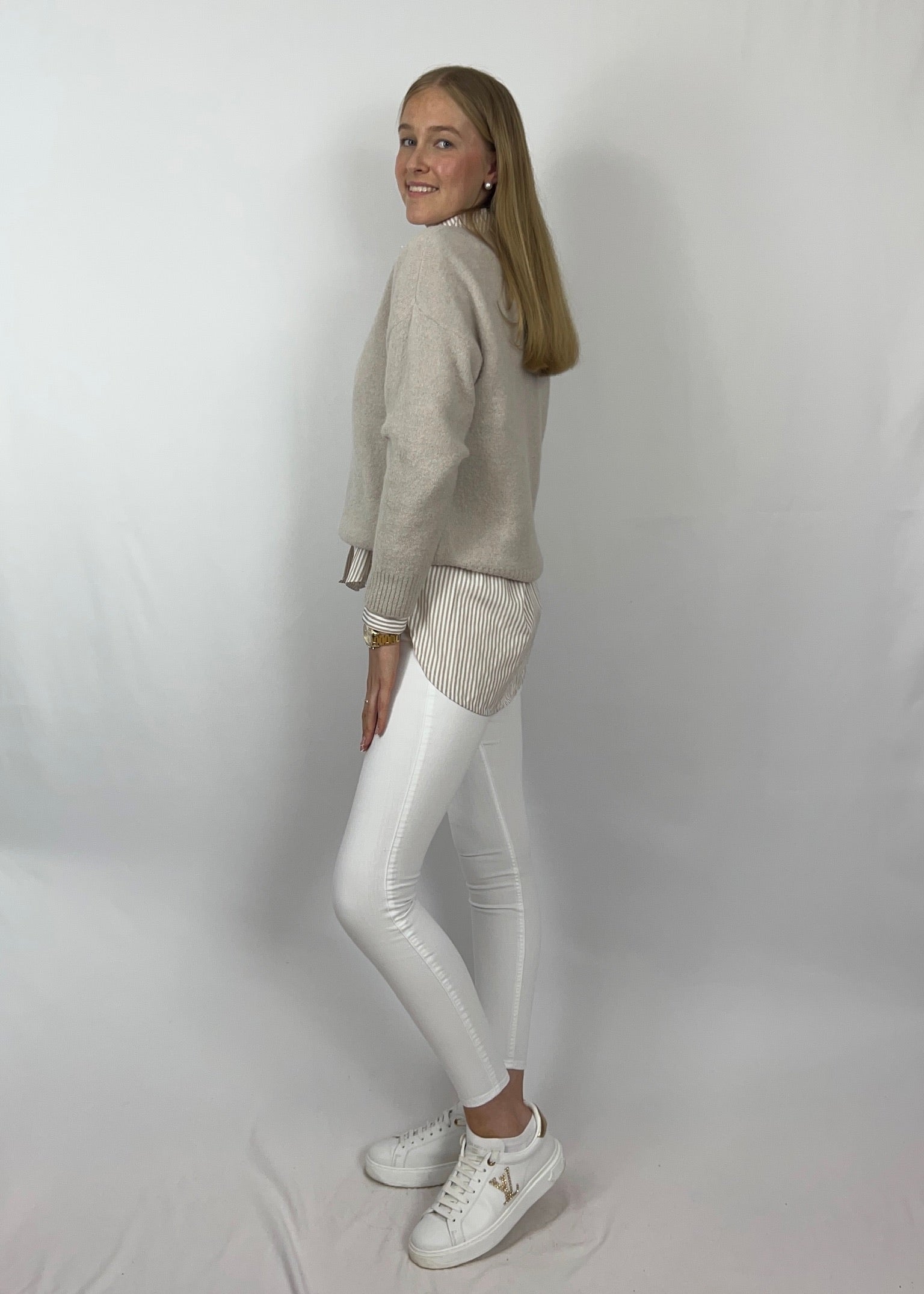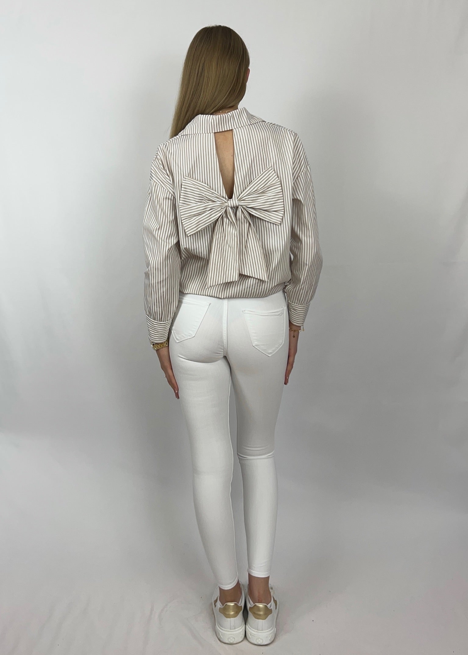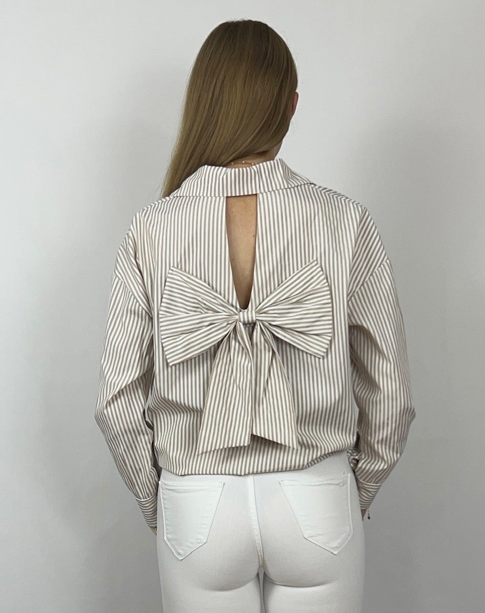 Das Hemd „Helia“ kombiniert klassische Streifen mit einem überraschenden Rückendetail: Die große Schleife und der dezente Rückenausschnitt machen dieses Piece zum absoluten Blickfang. Perfekt für alle, die feminine Highlights lieben und dennoch nicht auf Komfort verzichten möchten. Ein Must-have für stilvolle Everyday-Looks mit Wow-Effekt.