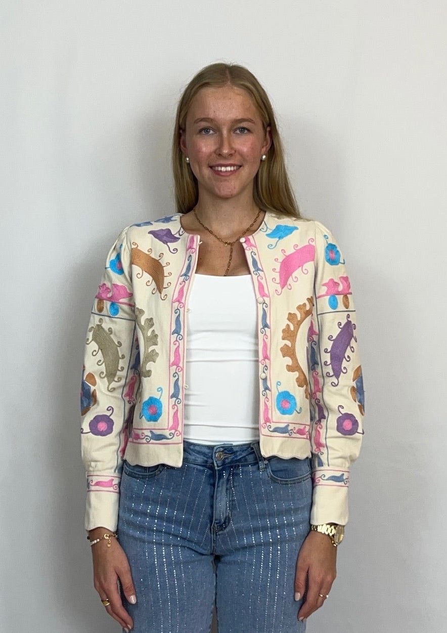 Die Julina Jacke mit Blumenstickerei ist wie ein Spaziergang durch einen sommerlichen Garten – detailverliebt, feminin und zeitlos schön. Zarte Stickereien in üppigen Blumenmustern verleihen dem Stoff eine verspielte Leichtigkeit, während die kräftigeren Farben an rosa Sonnenuntergänge und warme Spätsommerabende erinnern.