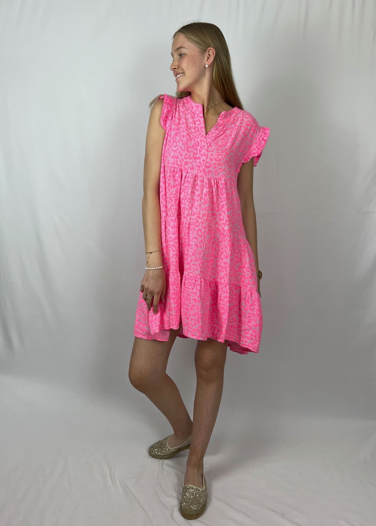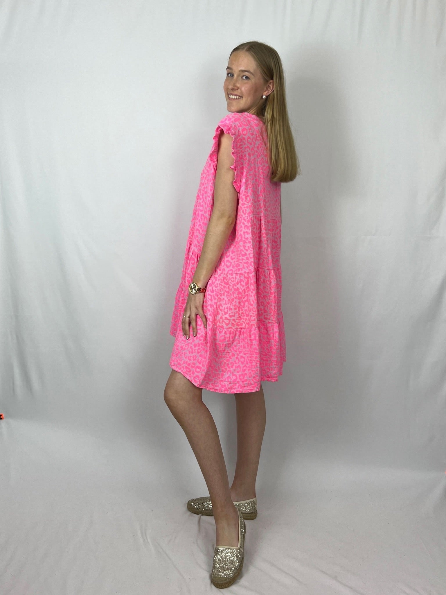 – das Leiluna Kleid mit pinkem Leo-Print ist ein echter Hingucker! Der lockere Schnitt sorgt für maximalen Komfort, während die zarten Rüschenärmel und die abgestufte Saumlinie dem Look eine feminine Leichtigkeit verleihen. Ob für einen Stadtbummel, den nächsten Urlaub oder einfach zum Wohlfühlen – mit Leiluna bringst du Farbe und gute Laune in deinen Tag!