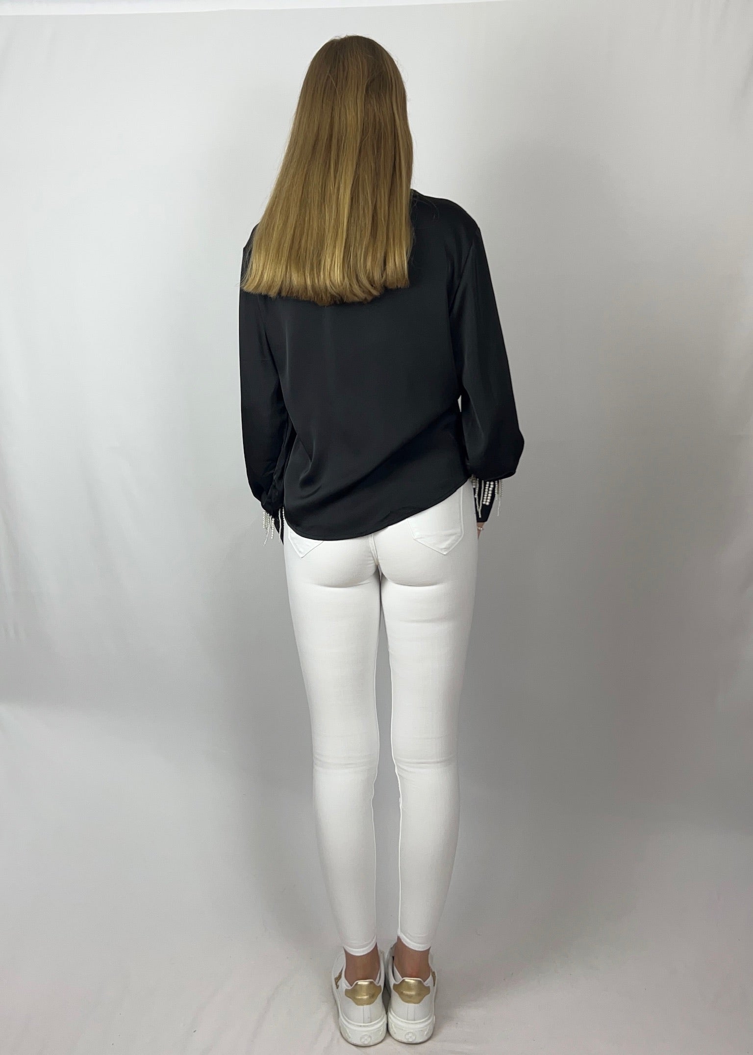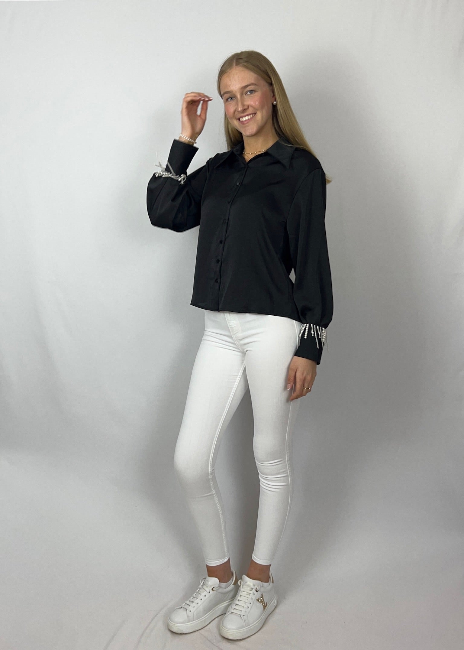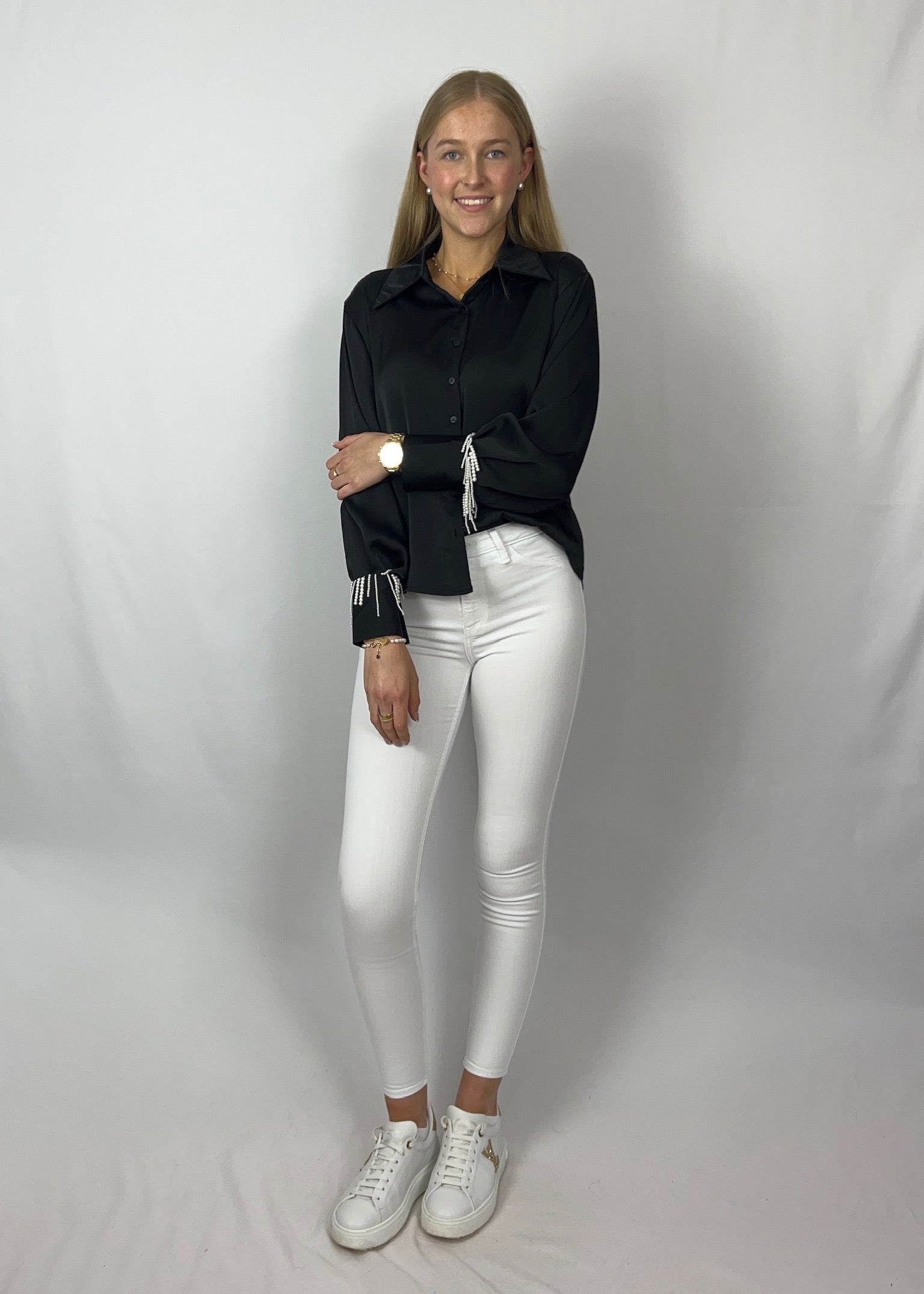 Diese fließende Satinbluse bringt feminine Eleganz auf ein neues Level: Die zarten Perlendetails an den Manschetten machen sie zum absoluten Highlight. Ob im Office, zum Dinner oder kombiniert mit Denim für den Casual-Chic – mit dieser Bluse setzt du immer ein stilvolles Statement.