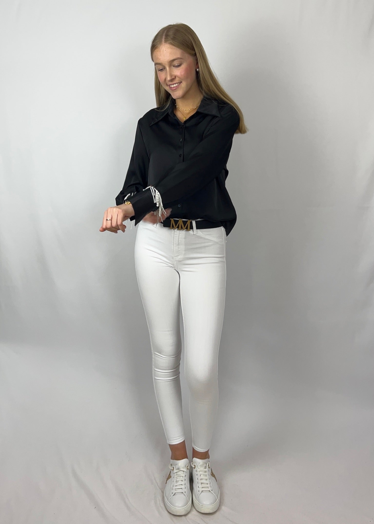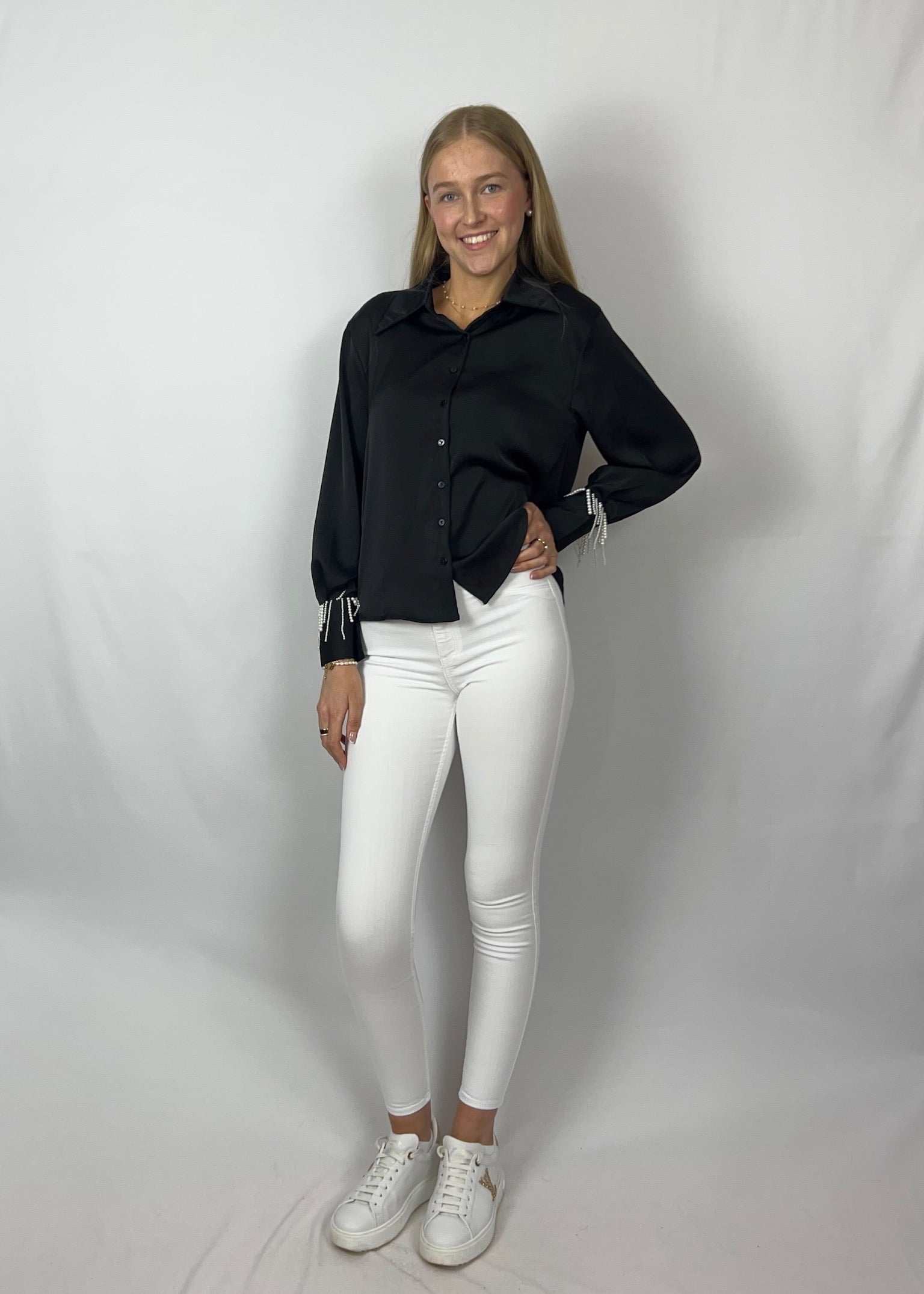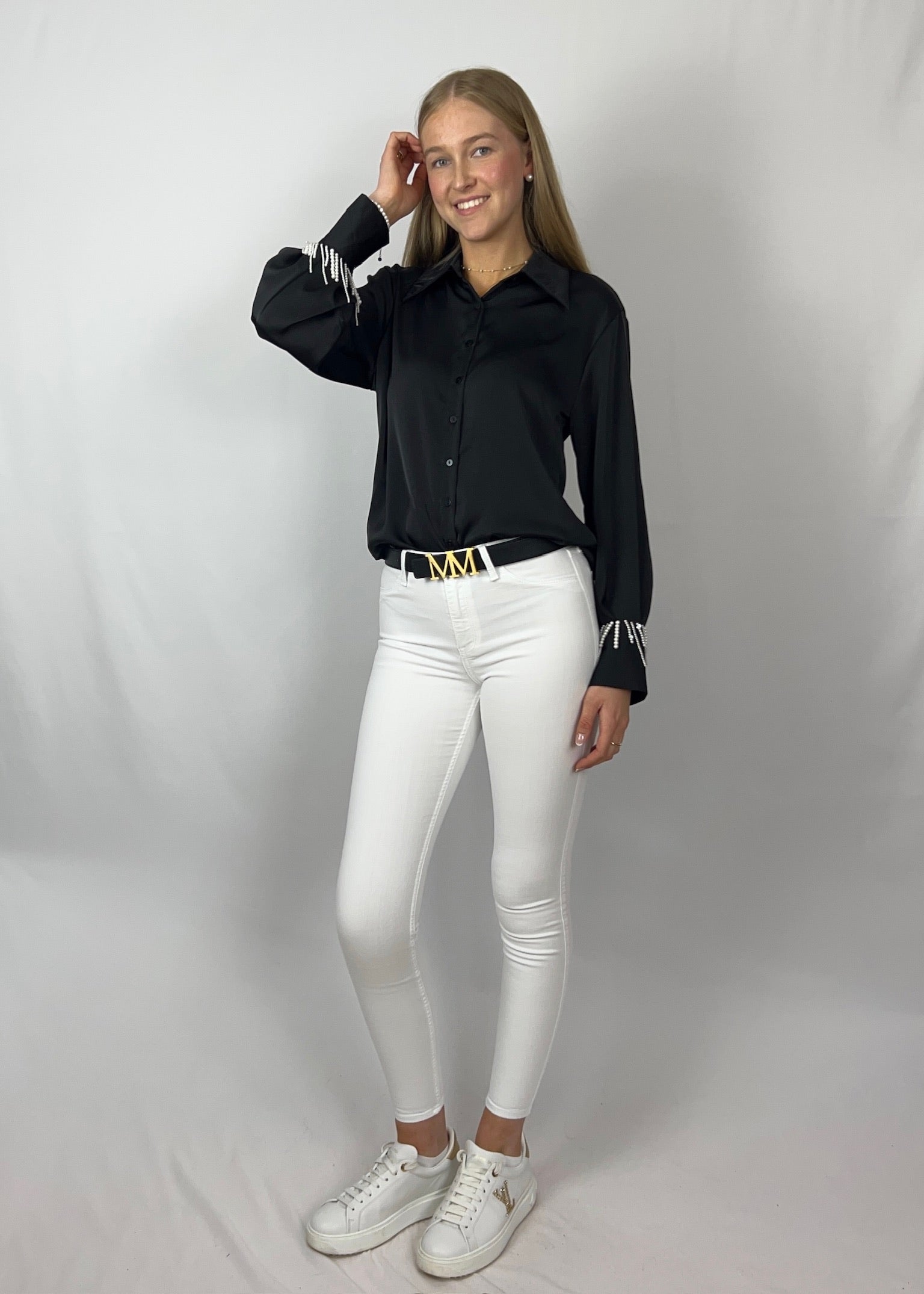 Diese fließende Satinbluse bringt feminine Eleganz auf ein neues Level: Die zarten Perlendetails an den Manschetten machen sie zum absoluten Highlight. Ob im Office, zum Dinner oder kombiniert mit Denim für den Casual-Chic – mit dieser Bluse setzt du immer ein stilvolles Statement.