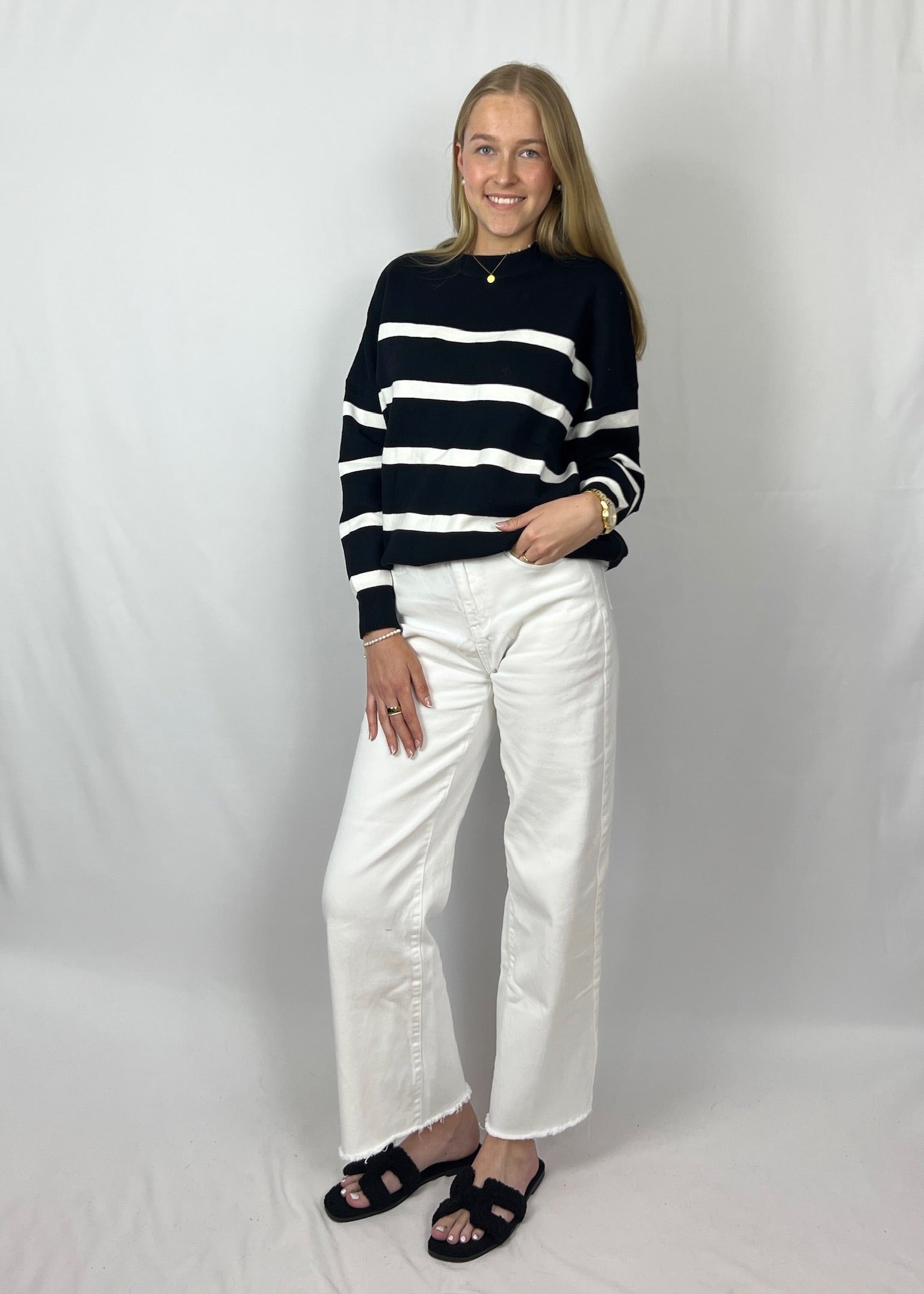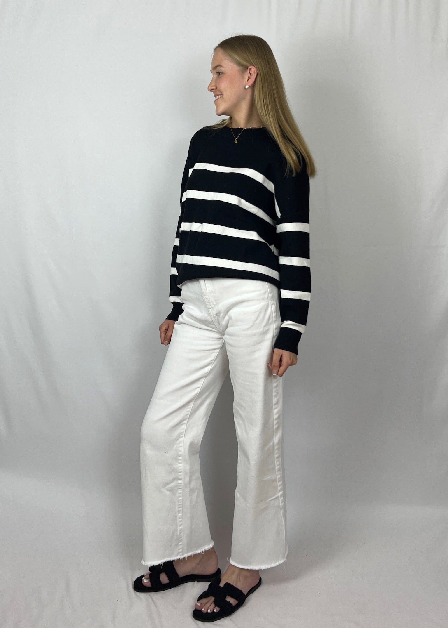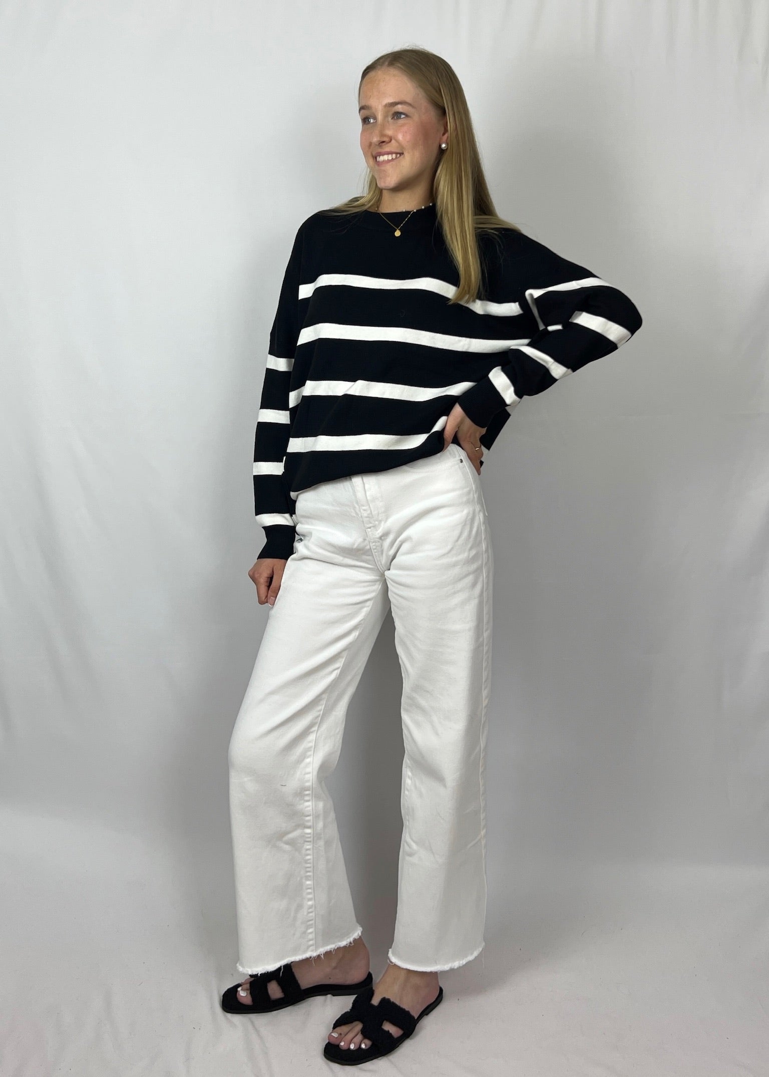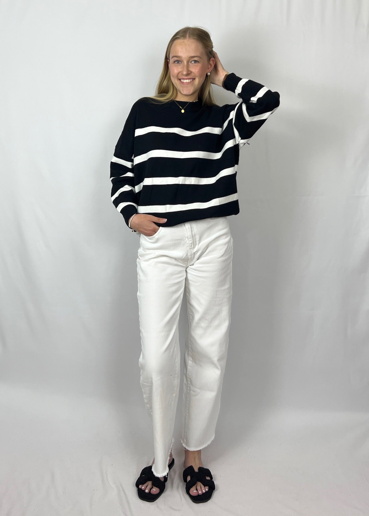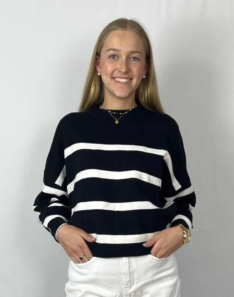 Pauline spielt mit klassischer Streifenoptik und zeitgemäß cleanen Linien: Der weiche Stoff fühlt sich angenehm leicht an und bringt dank des feinen Rippstricks eine zurückhaltende Struktur ins Spiel. Der leicht lässige Schnitt umspielt die Hüfte, während die Rippenbündchen an Ärmeln und Saum für guten Sitz sorgen.