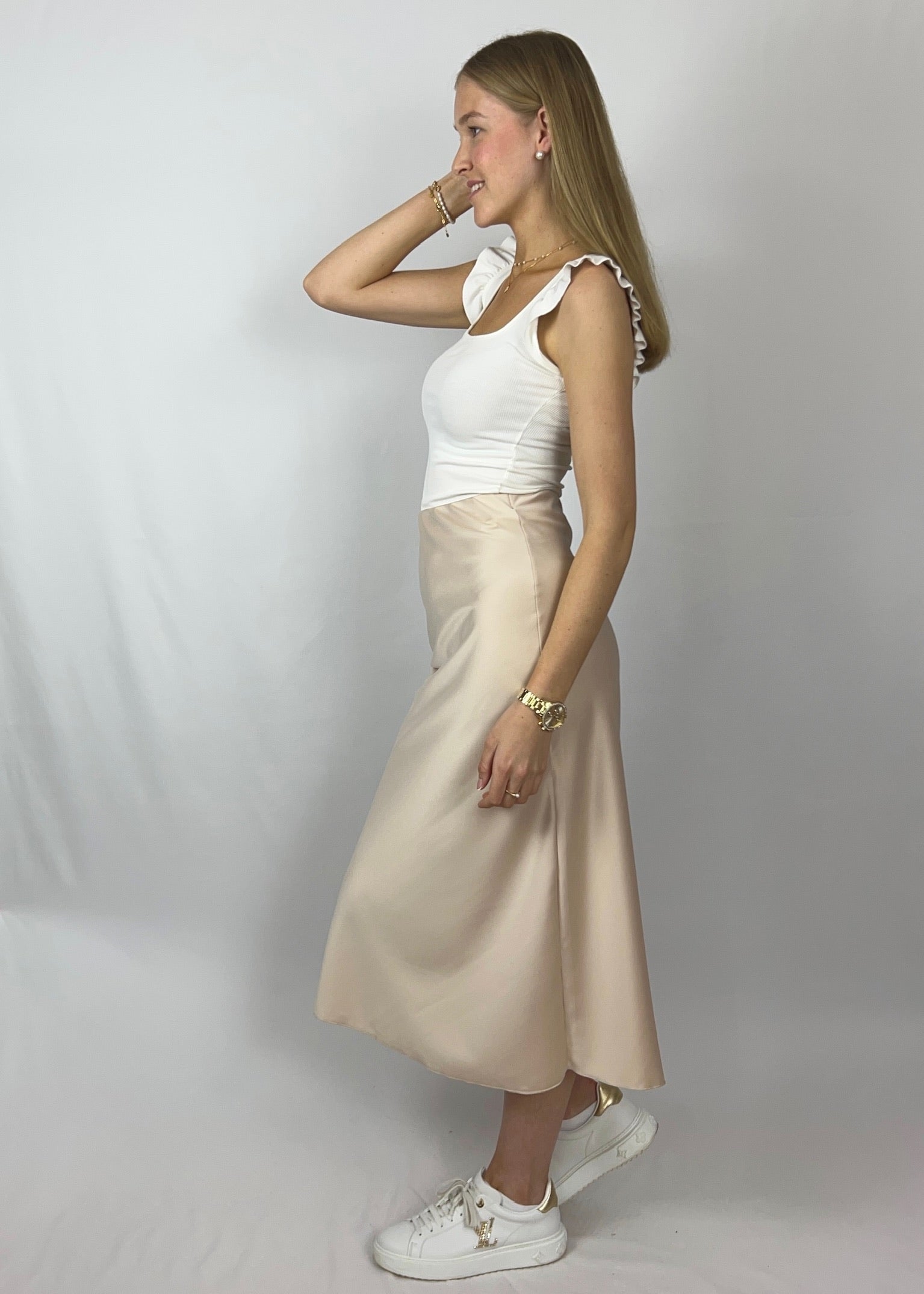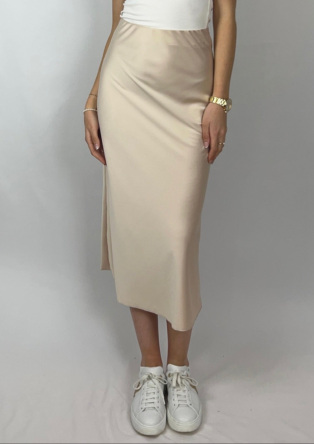 Sarina vereint Schlichtheit mit Eleganz. Der fließende Satinstoff fällt weich und sorgt mit seinem dezenten Glanz für eine feminine Silhouette – ganz ohne viel Aufwand. Der lange, gerade Schnitt wirkt ruhig und edel, während der elastische Bund für ein angenehmes Tragegefühl sorgt.