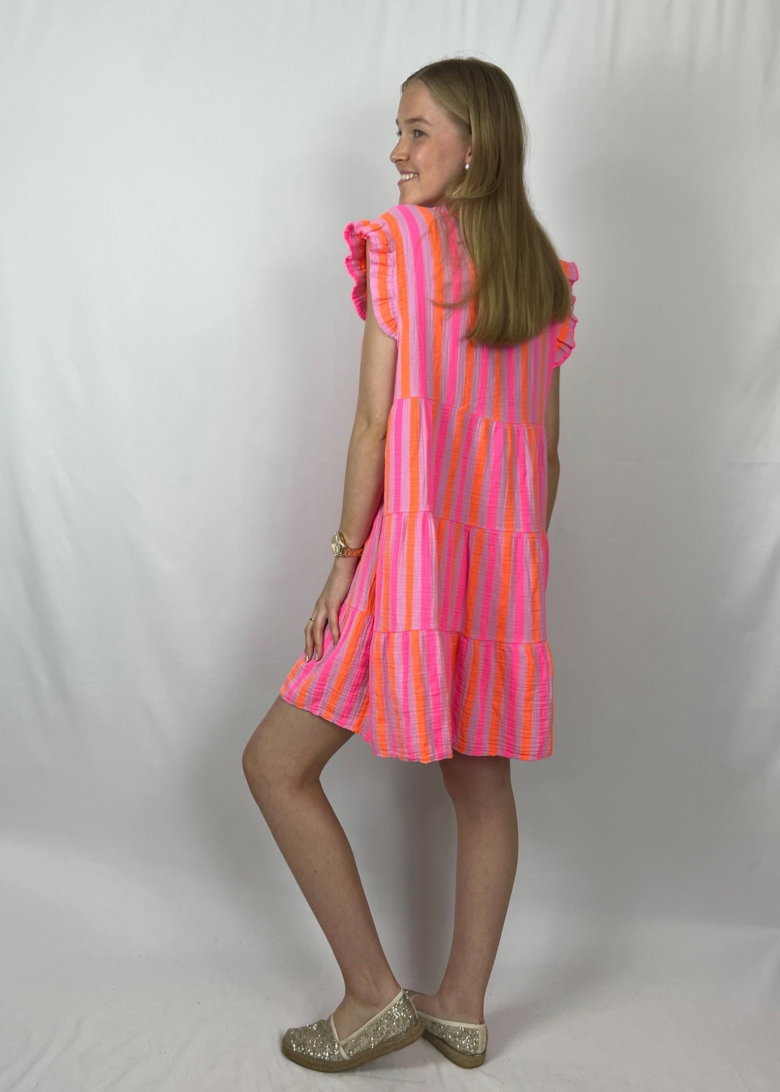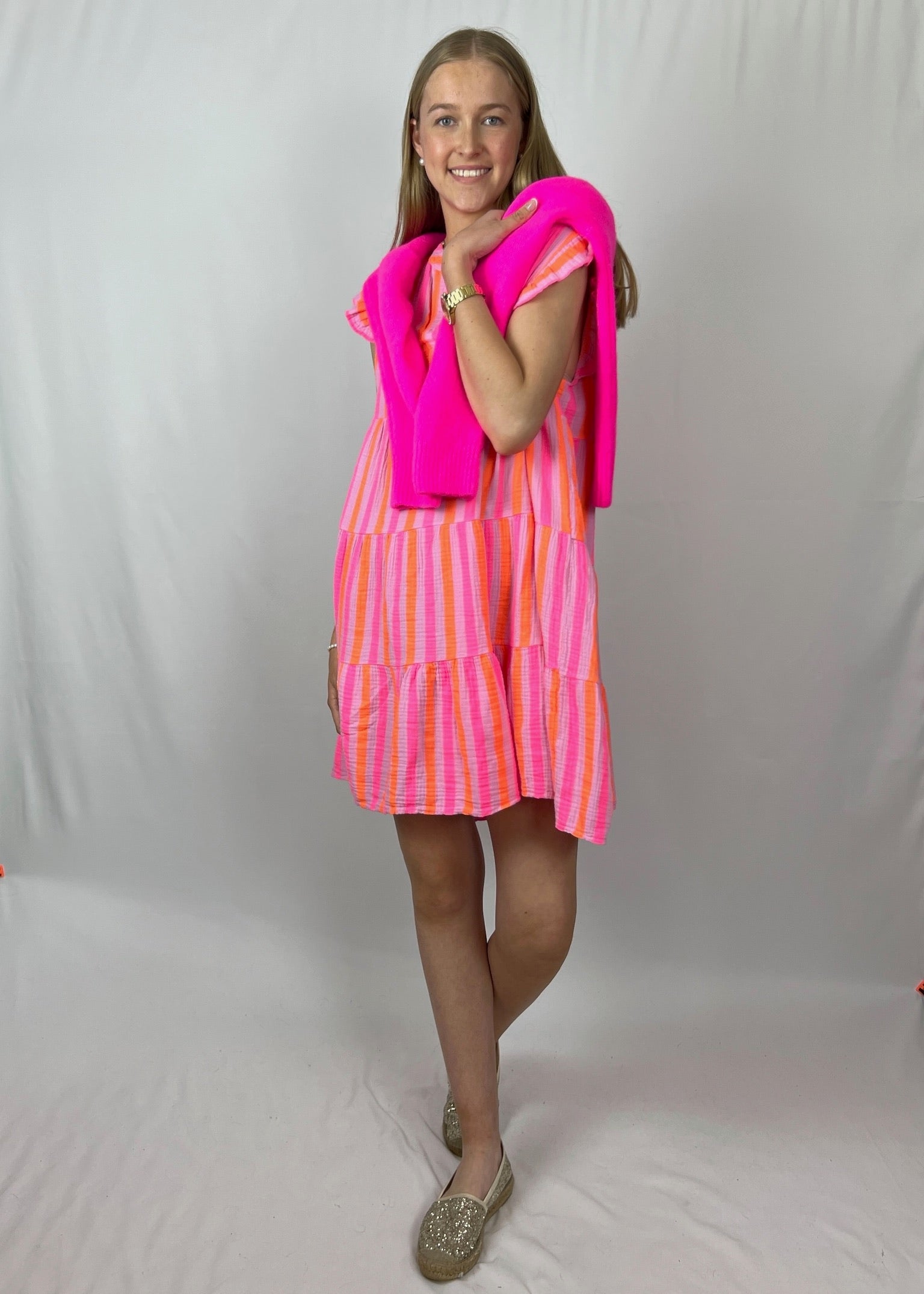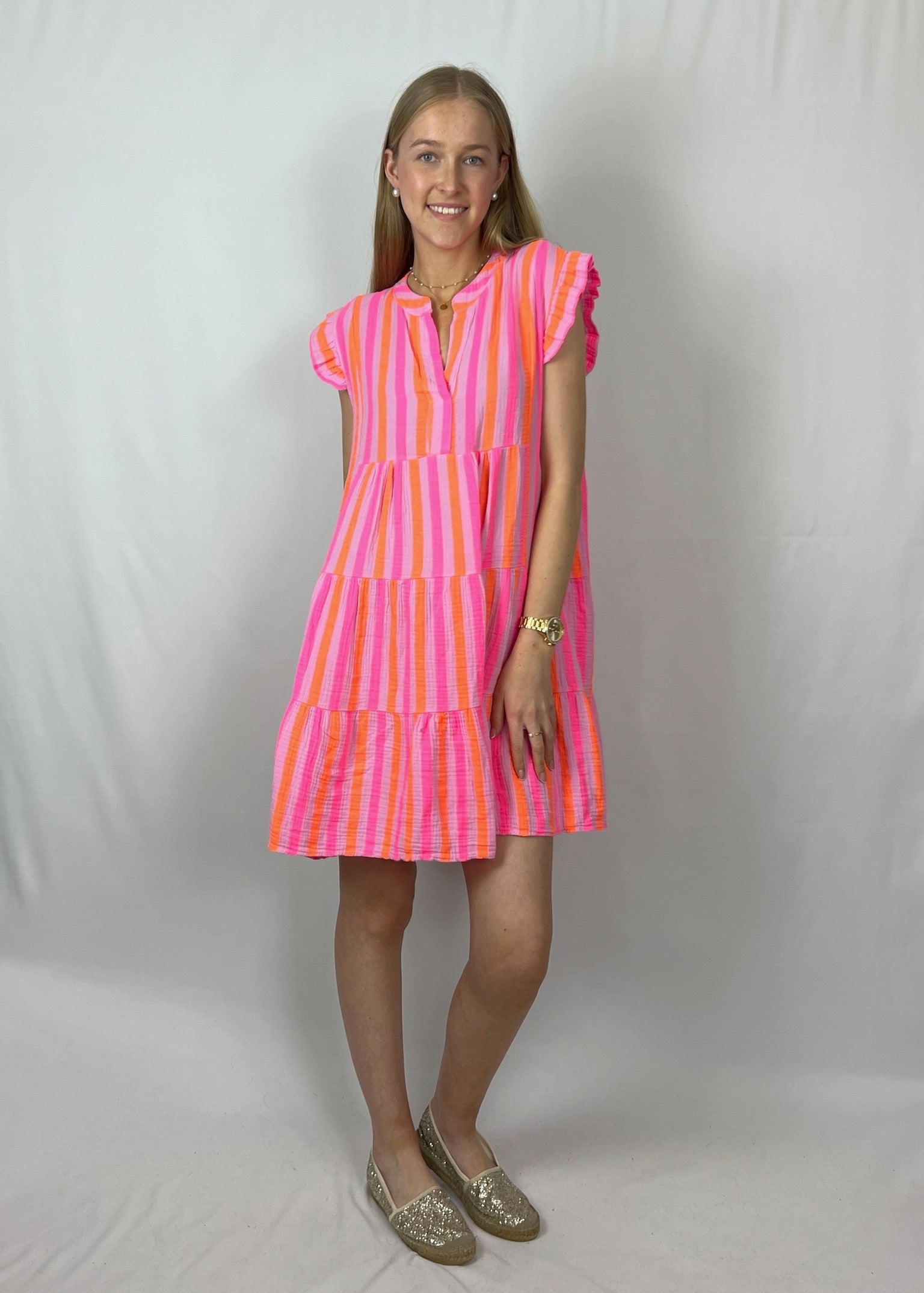 Ein Farbtraum in Pink, Orange – das Sara Kleid ist der perfekte Begleiter für sonnige Tage ☀️