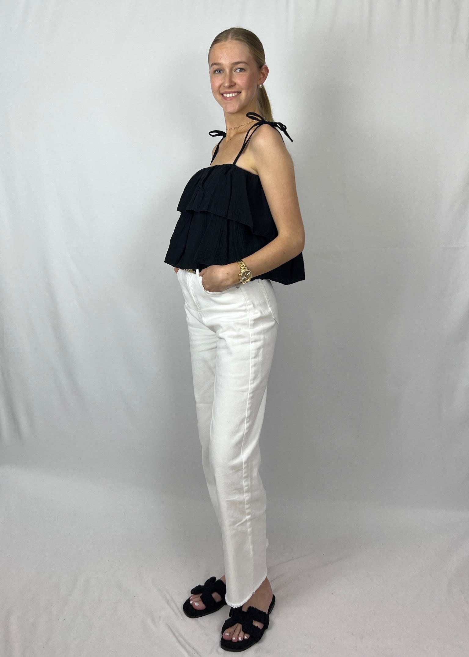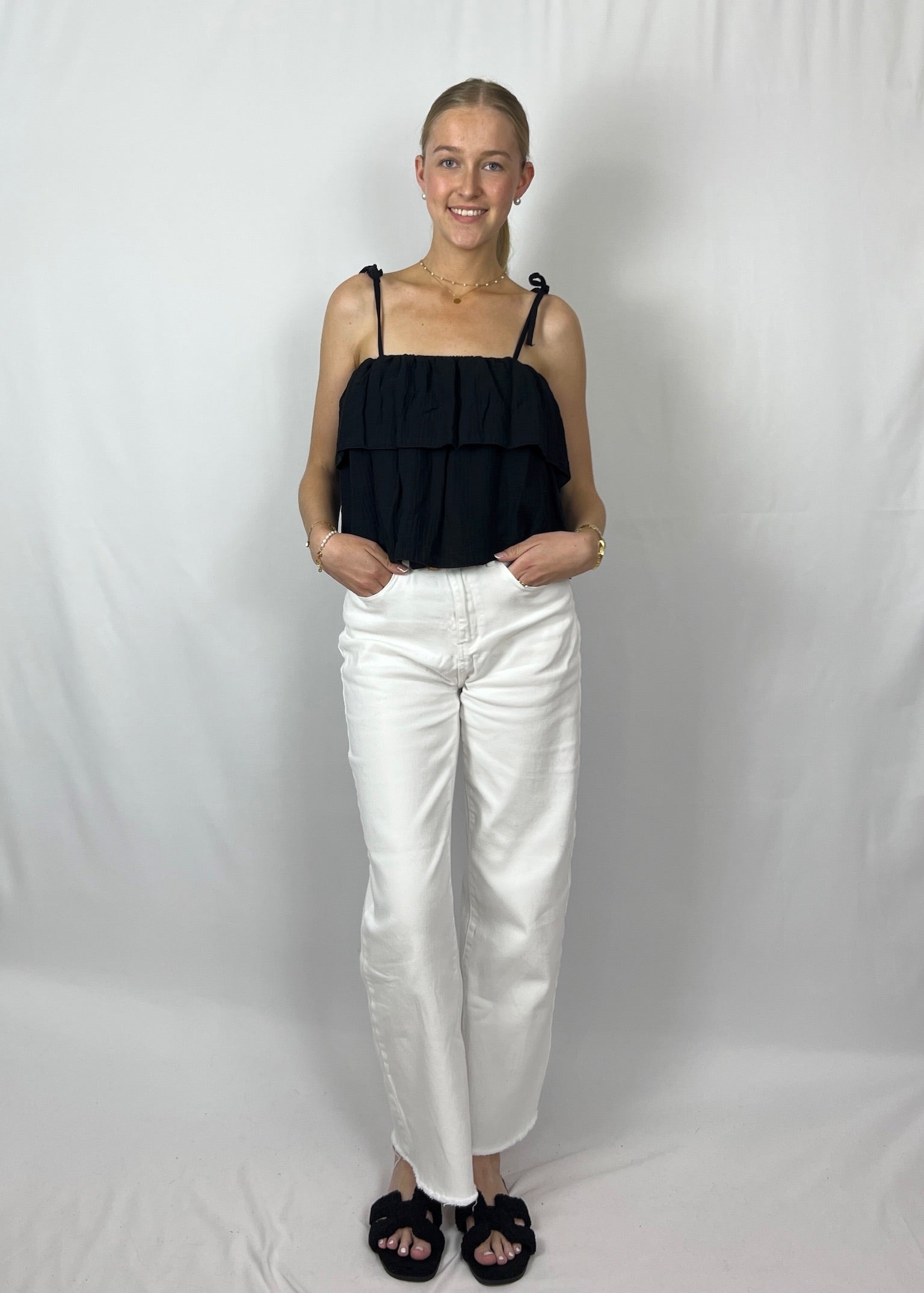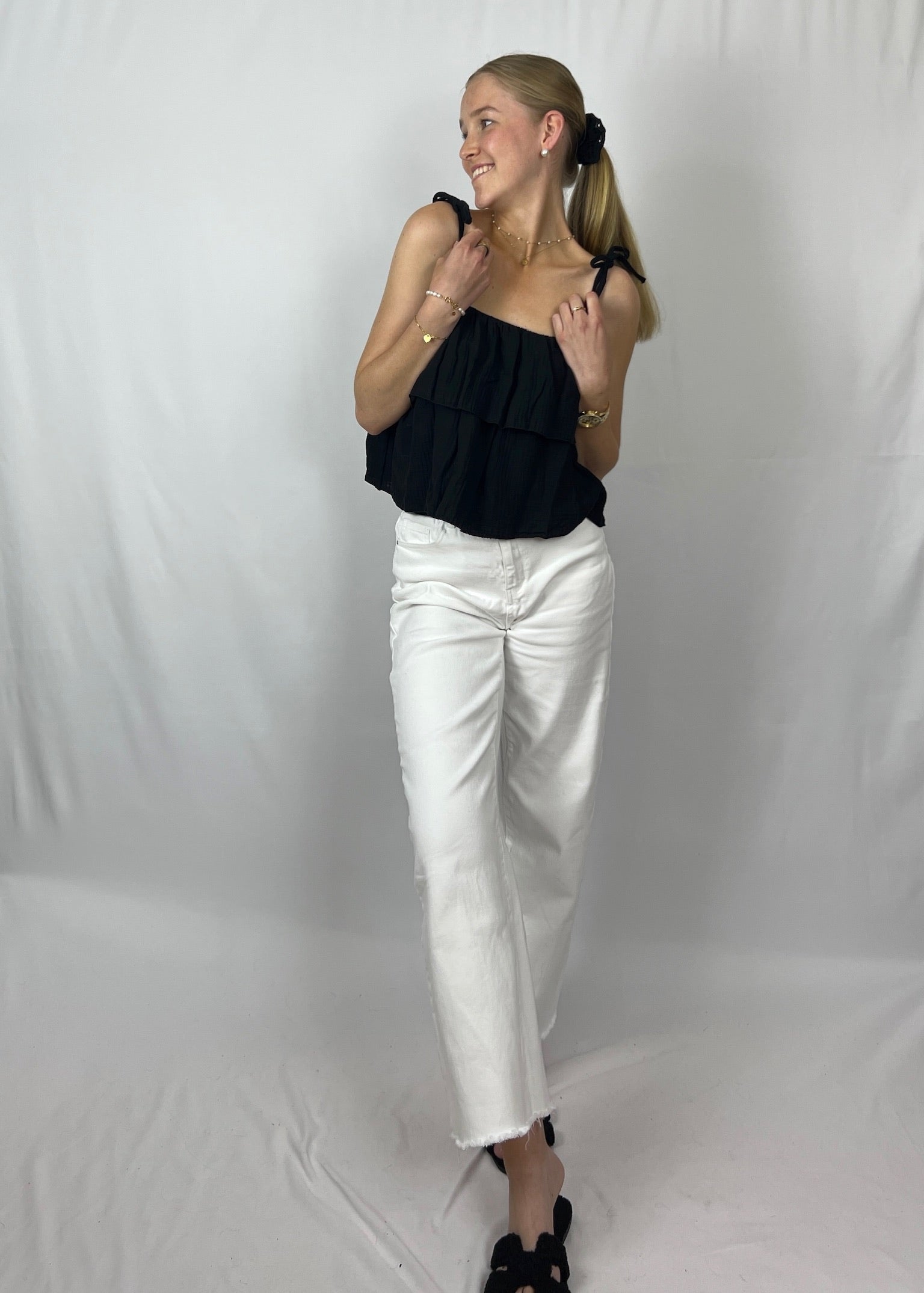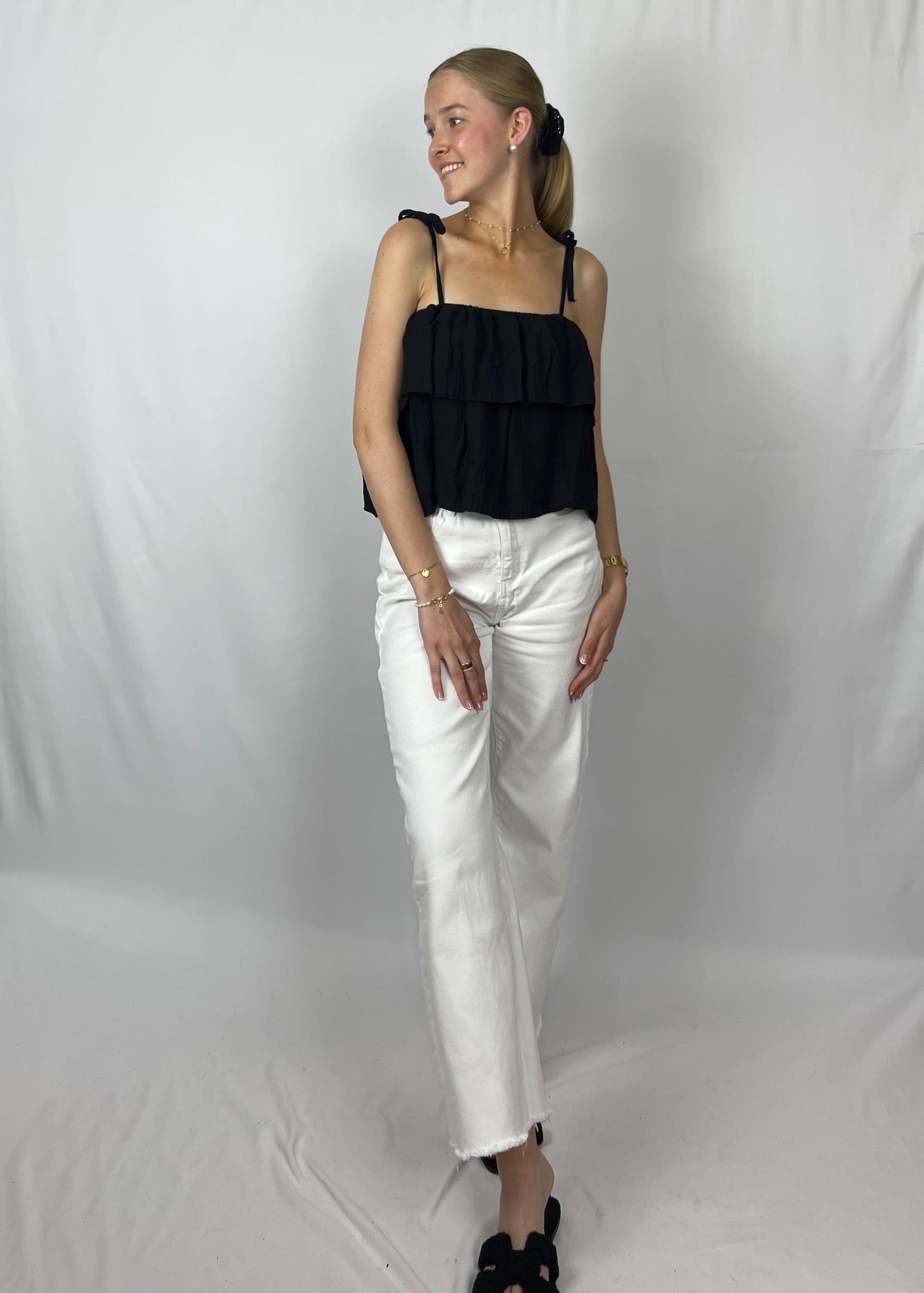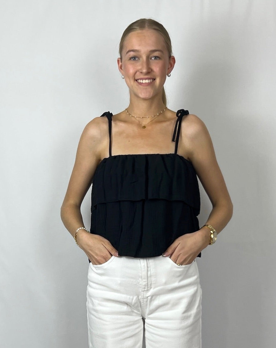 Tomina besticht durch ihre lockere, fließende Fall‑Optik und die zarten Träger mit verspielten Schleifen. Der weiche, leicht strukturierte Stoff umspielt den Körper und sorgt für ein angenehmes Tragegefühl – besonders an warmen Tagen. Ob solo zum Denim-Shorts‑Look oder zu einer langen Hose: Tomina setzt mit ihrem Schnürdetail immer einen charmanten Akzent.